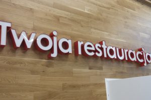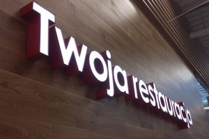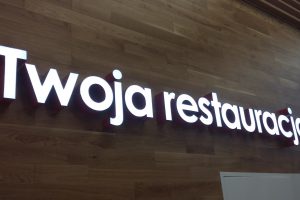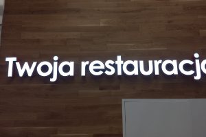 Podświetlane litery 3D wykonaliśmy z taśmy aluminiowej Alurapid, których fronty wyfrezowaliśmy na frezarce CNC z #3mm plexi opalizowanej przeznaczonej do podświetleń.